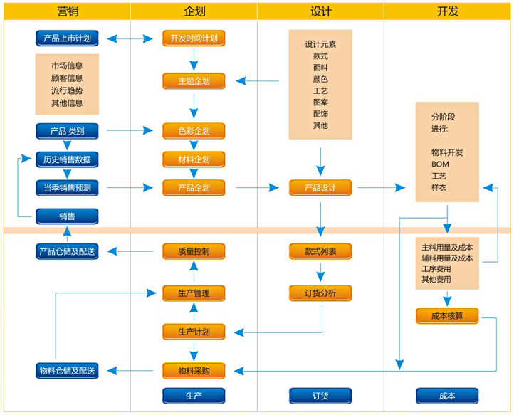 服装的季节性强,必须进行清晰的生命周期管理。品牌服装的运作环节中不可缺少服装的设计环节,ZARA等快速供应链的企业,从产品设计到上货只需求很短的时间,通过产品设计管理,使得信息化从产品设计源头就开始,将产品的生产周期、生产工艺、上货期数在设计阶段就进行定义。设计必须面向市场,通过市场动态分析报表,设计师可有效把握当前流行趋势,设计出潮流精品。产品设计一旦完成,设计阶段的原始信息就会进入供应链进行快速运作,大大提供供应链系统的运作效率和准确度。