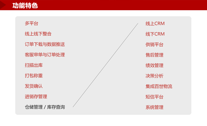 功能特色 1)淘宝聚石塔华南区核心合作伙伴 2)技术不断创新,基于Linux/MySQL/Java平台,真正的聚石塔云系统,稳定高效 3)功能强大的客服处理CRM,大大的提升客户业绩 4)强大的WMS功能,提升电商企业日常运作效率 5)丰富的信息化产品开发经验,满足电商企业规模发展的需求 6)O2O线上线下整合,全方位抓住客户 7)成熟稳健的技术开发、业务咨询和实施服务体系